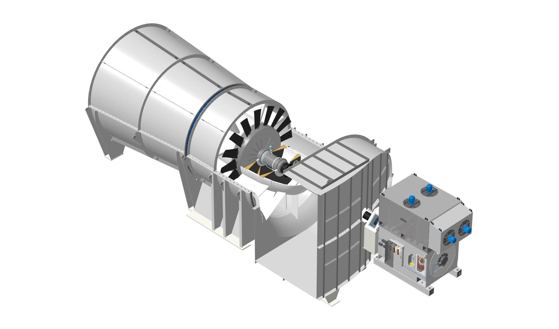 - Принцип действия: Воздух поступает вдоль оси вращения, затем под действием центробежной силы отбрасывается лопатками рабочего колеса в радиальном направлении в спиральный отвод (улитку).